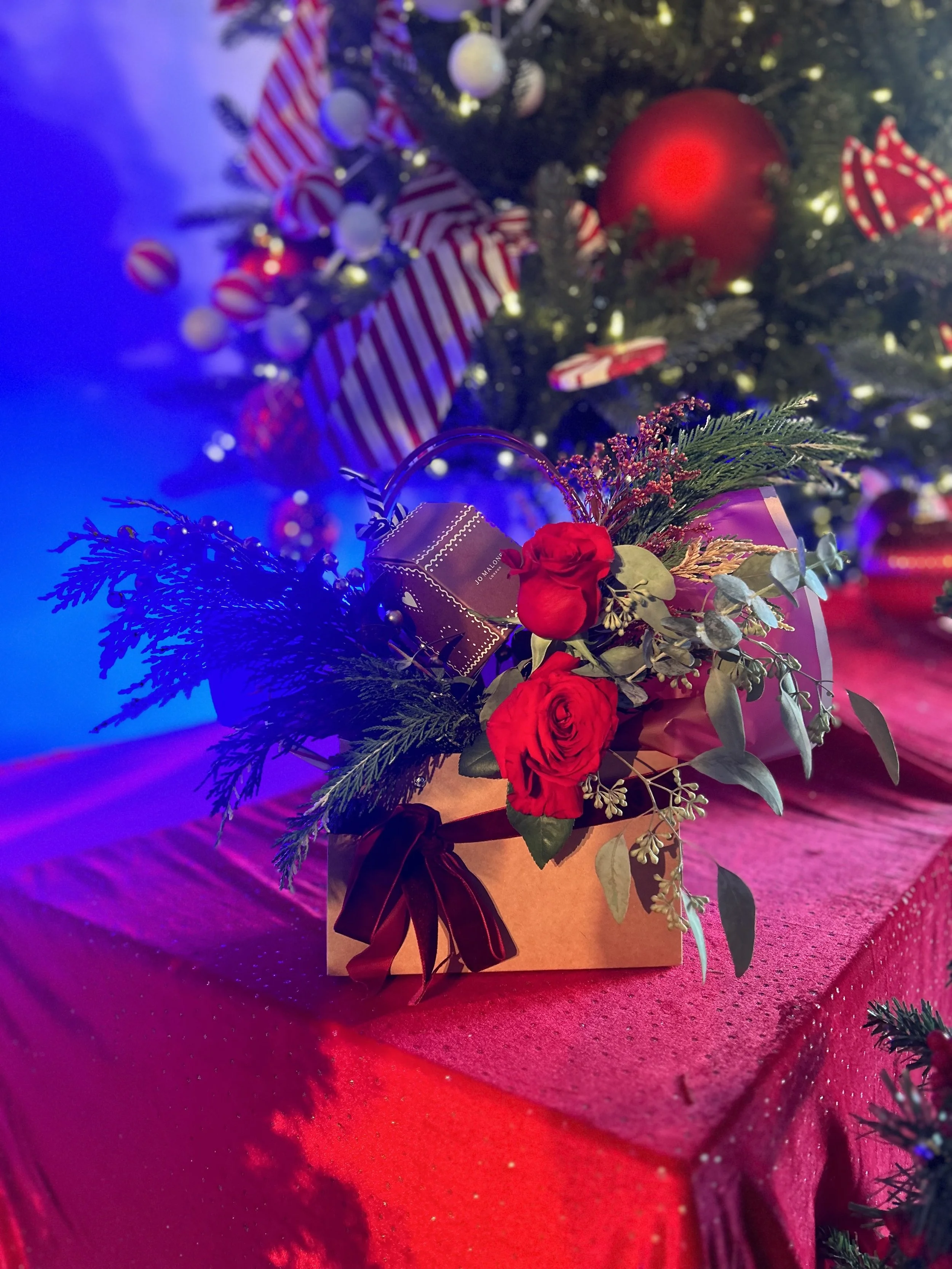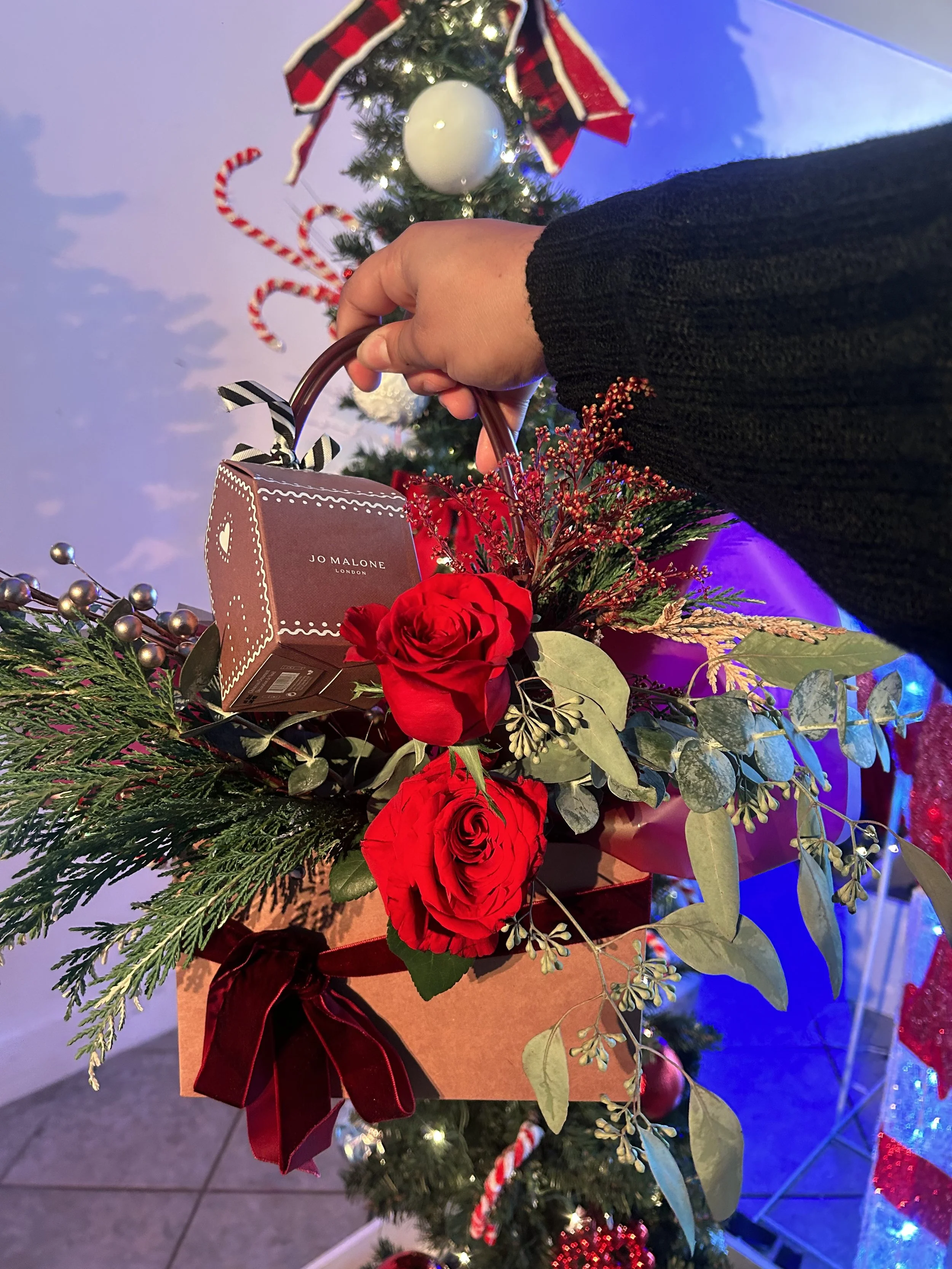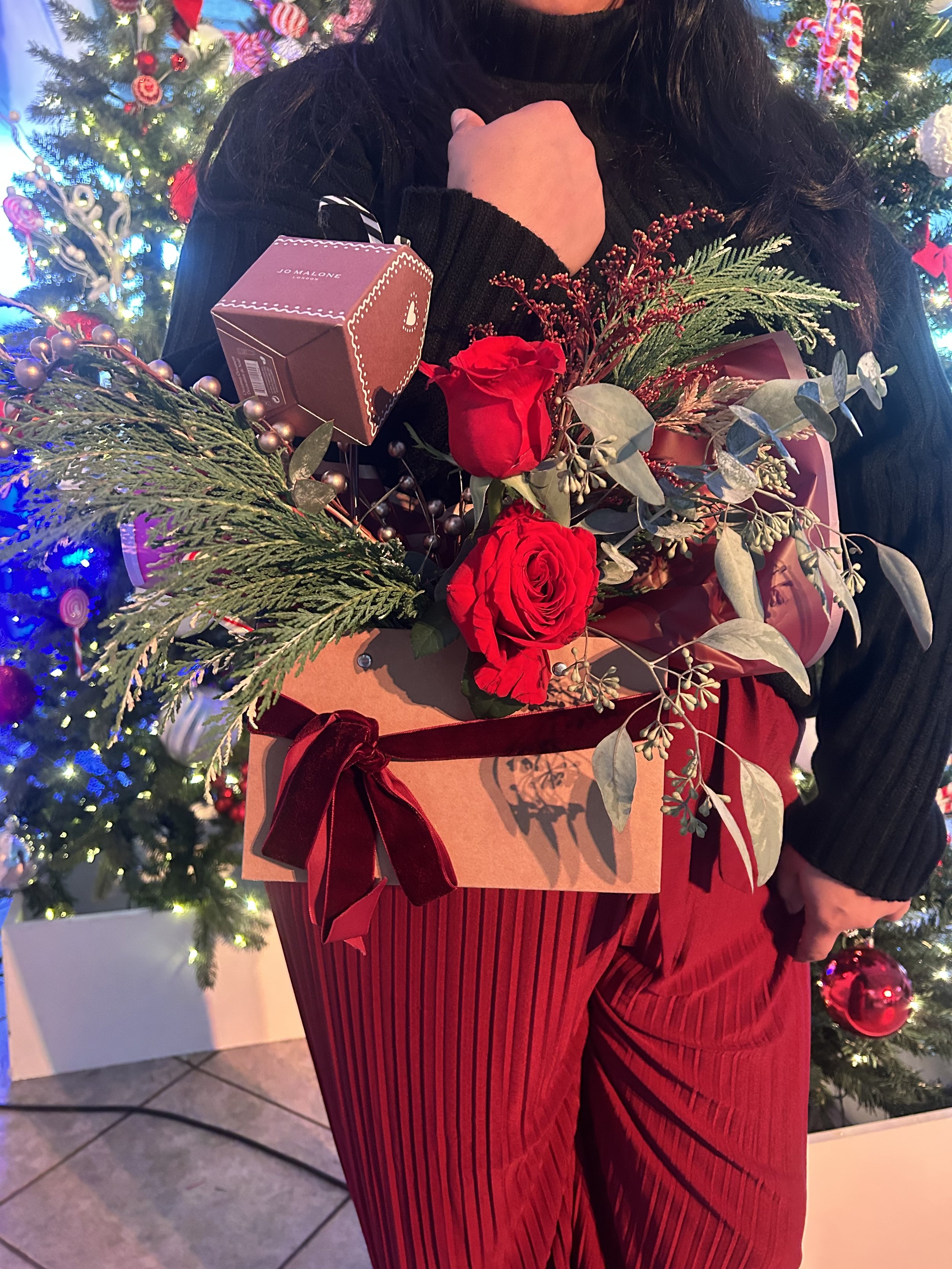 Add a touch of festive elegance to your celebrations with our Holiday Charm Arrangement. Featuring lush, velvety red roses paired with vibrant evergreens, eucalyptus leaves, and delicate seasonal accents, this bouquet exudes timeless beauty and holiday cheer. Handcrafted in a chic carry bag with a luxurious ribbon, it’s the perfect gift or centerpiece for the season.